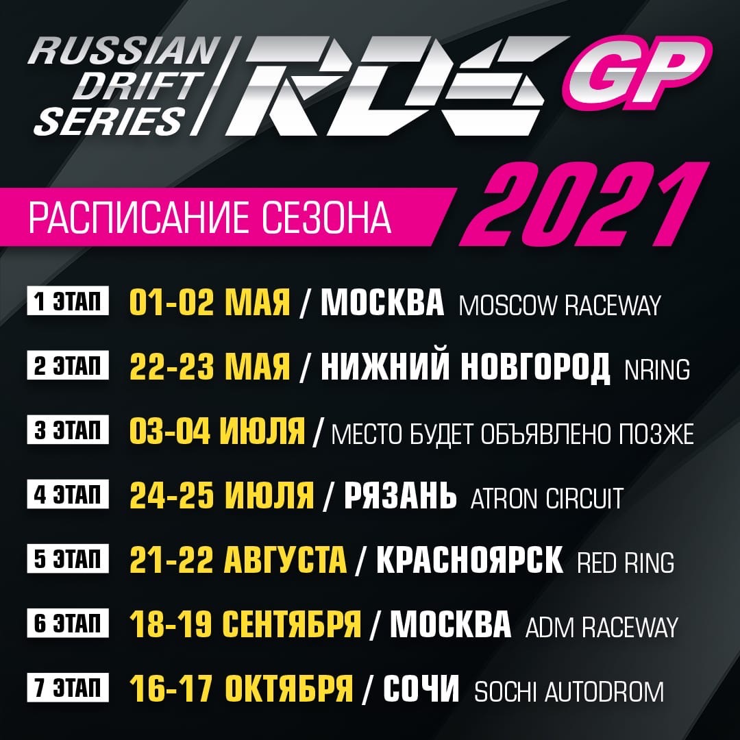 В 2021 году главный Чемпионат страны по дрифту пройдет в 7 этапов в 6 городах России. По традиции сезон начнётся в Москве, а завершится в Сочи. К радости сибирских болельщиков, после прошлогоднего перерыва в календарь вернулся Красноярск и любимая пилотами трасса «Красное Кольцо». Место проведения третьего этапа уточняется.